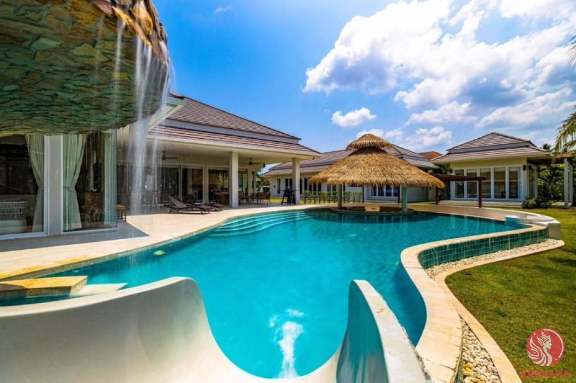 This amazingly luxurious 7-bedroom Tropical pool villa is the ultimate in luxury living! The Villa has 7 Bedrooms, 4 bedrooms in the main house, all with en-suite bathrooms and 3 of the bathrooms also have bathtubs and outside showers. There is a further 2 bedroom guest house with a shared bathroom, small kitchen and an adjoining games room with lounge area, pool table and bar and the guest house also has 1 bedroom en-suite/maid room. Inside the villa there is a wide-open plan living, dining and European style kitchen area which has plenty of space to enjoy meals at the dining table or relaxing watching TV, or just enjoy the pool table and games room with friends or family. The property is top spec with all modern amenities and utilities and there is also a sauna in the property Outside is an Oasis with a huge pool, water slide and fantastic featured waterfall, the pool also has a fully equipped sunken bar with fridge. The large outdoor terrace is perfectly set up with a large BBQ and plenty of dining space and shade. This villa is located in peaceful surroundings and approximately a 10-minute drive from Hua Hin City Center and beaches. Please contact us for more information and to arrange a viewing.