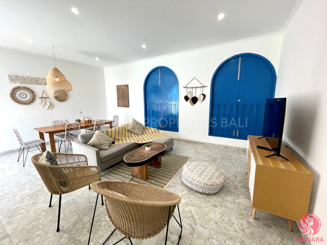 Discover a striking villa in Seminyak’s prestigious Batu Belig area, Bali. Priced at IDR 7,700,000,000, it’s a standout investment in one of the island’s prime spots, offering luxury, serenity, and a superb location. Spanning a 346 sqm land area and a 180 sqm build, this ready-to-occupy villa radiates an elegant Santorini charm. Fresh from completion in 2023, it mixes newness with timeless design. Fully furnished, it hosts six plush bedrooms and four chic bathrooms. Each space is a design feat, promising exclusive comfort. At its core, the enclosed living area melds a modern kitchen, dining, and lounge, creating a relaxing and entertaining sanctuary.