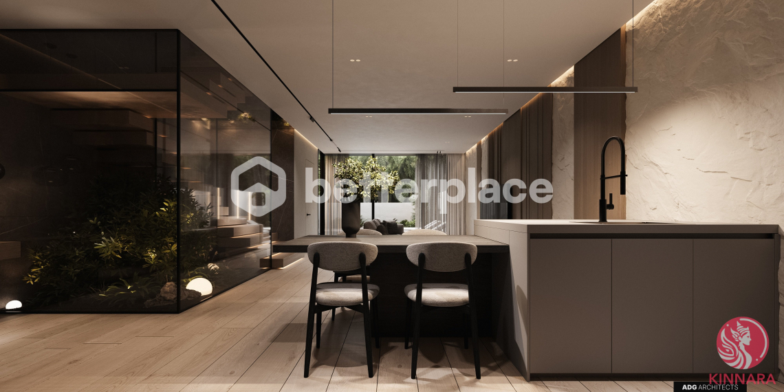 One of the standout features of this villa is its stylish staircase, which serves as both a design element and a functional connection between the two floors. The upper level houses two spacious bedrooms, each designed with comfort and tranquility in mind. The full-sized bathroom is fitted with high-quality fixtures, ensuring a spa-like experience in the comfort of your home. Glass partitions, natural wood, and subtle lighting add to the villa’s sophisticated ambiance. The overall design prioritizes both aesthetics and practicality, making it an ideal residence for those who appreciate modern architecture with a touch of warmth.