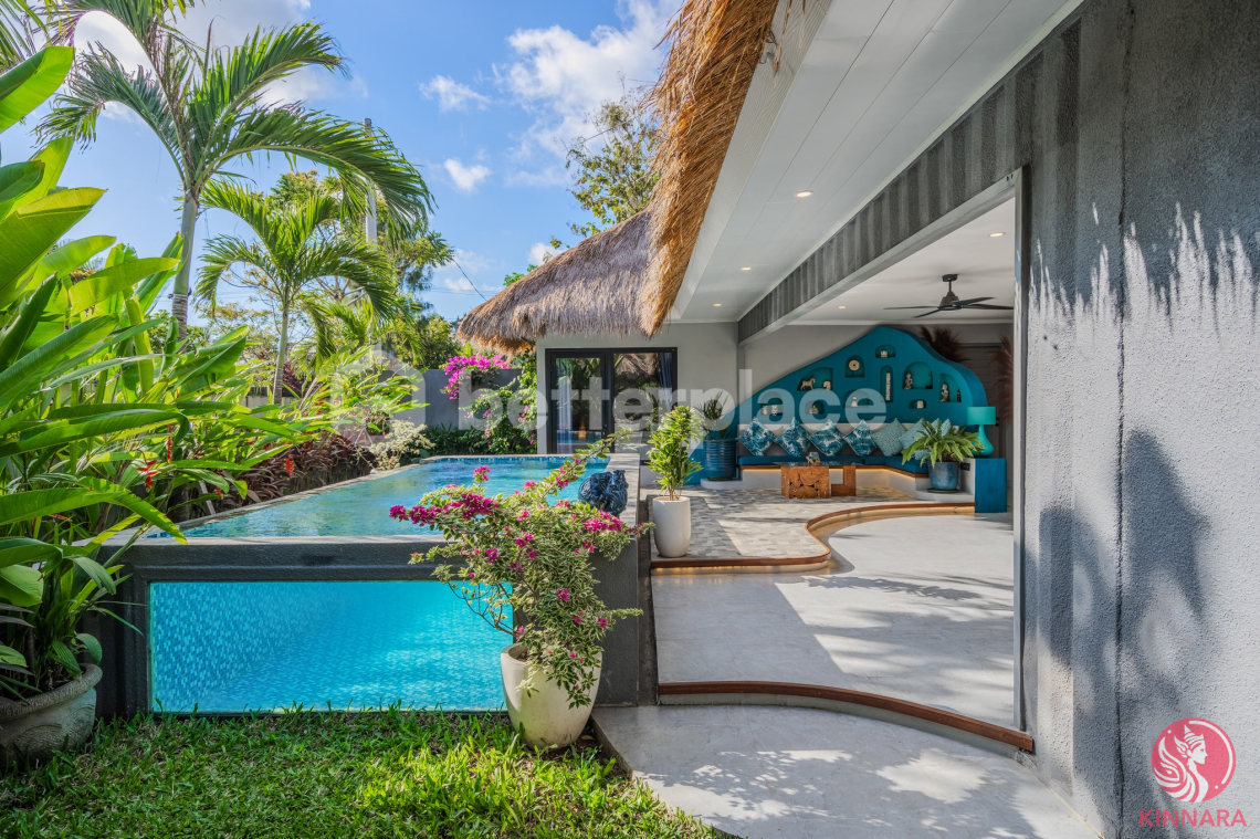 The villa’s design is inspired by contemporary tropical aesthetics, as showcased in the attached image. It boasts an open layout with ample natural light, accentuating the vibrant colors and unique architectural details. The living area is tastefully decorated with comfortable furnishings and stylish decor, creating a welcoming ambiance. The outdoor area is equally impressive, featuring a private pool, perfect for leisurely swims and sunbathing. The villa’s design prioritizes both comfort and style, making it an ideal retreat.