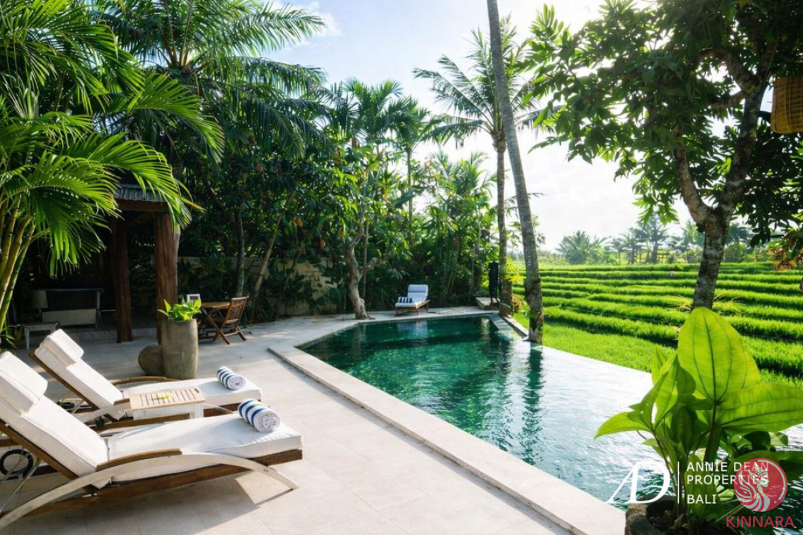 This rustic-style villa is set on 950 square meters of land and features a building size of 296 square meters. It includes three spacious bedrooms, each with its ensuite bathroom. The villa boasts a fully equipped kitchen, a comfortable dining area, and a living room with stunning views of the lush greenery and swimming pool, staff quarters, storage space, and secure parking.