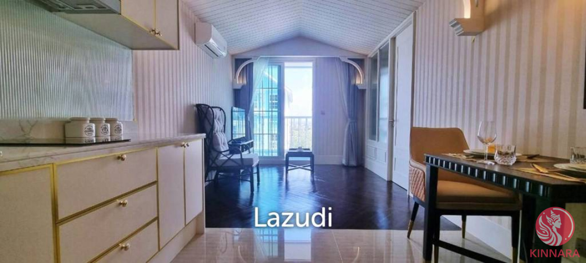 This is 1 Bedroom, 1 Bathroom Condo for Sale in Na Jomtien, offering 42.21 Sqm of living area, located on the 6th floor, comes full furnished, European kitchen, large living area, sofa, dining table, built-in wardrobe, en-suite bathroom, and balcony with pool view.