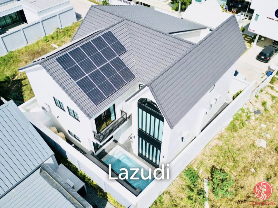 This is Modern luxury pool villa 3 Bedrooms, 6 Bathrooms for Sale in Toongklom - Talman, sitting on 1,216 Sqm of land plot size, 500 Sqm of usable area, comes fully furnished, European kitchen with full equiptment, open plan living area with comfortable sofa, sizeable bedroom, built-in wardrobe, en-sutie bathroom with bath tub, covered car parking for up to 3 cars, and pool with jacuzzi.
