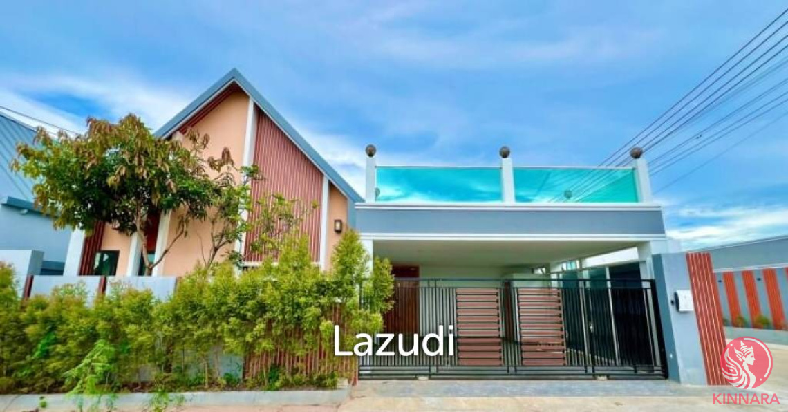 Nordic Pool Villa 3 Bedrooms, 4 Bathrooms for Sale in East Pattaya. Is Available in Thai Name Ownership, sitting on 280 Sqm of land plot size, 188.58 Sqm of useable area, comes full furnished, Thai and European kitchen, full air con, Built-in furniture, en-suite bathroom, open plan living area, and outdoor space included private swimming pool .