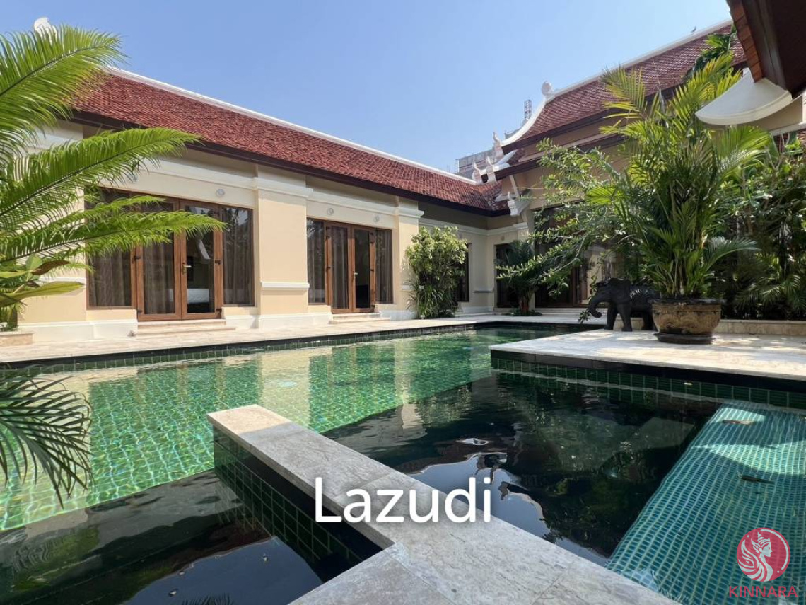 This is 4 Bedrooms, 5 Bathrooms Thai Bali Style Villa for Sale in Na Jomtien, sitting on 856 Sqm of land plot size 334 Sqm of usable area, comes full furnished, built-in European kitchen with full equipment, electric hob, electric oven, dining area, counter, large living area with comfortable sofa, flat screen TV, sizeable bedrooms, walk in closet, en-suite bathrooms with bath tub, balcony, roof terrace, private swimming pool, and garage.