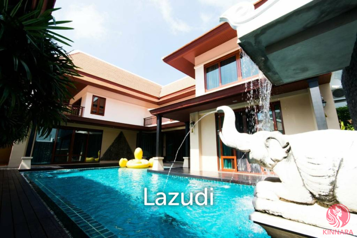 The house features five beautifully appointed bedrooms and seven modern bathrooms, providing privacy and convenience for all family members and guests. Culinary enthusiasts will appreciate the dual kitchens—a traditional Thai kitchen complemented by a fully equipped European kitchen—perfect for preparing meals with ease and style.