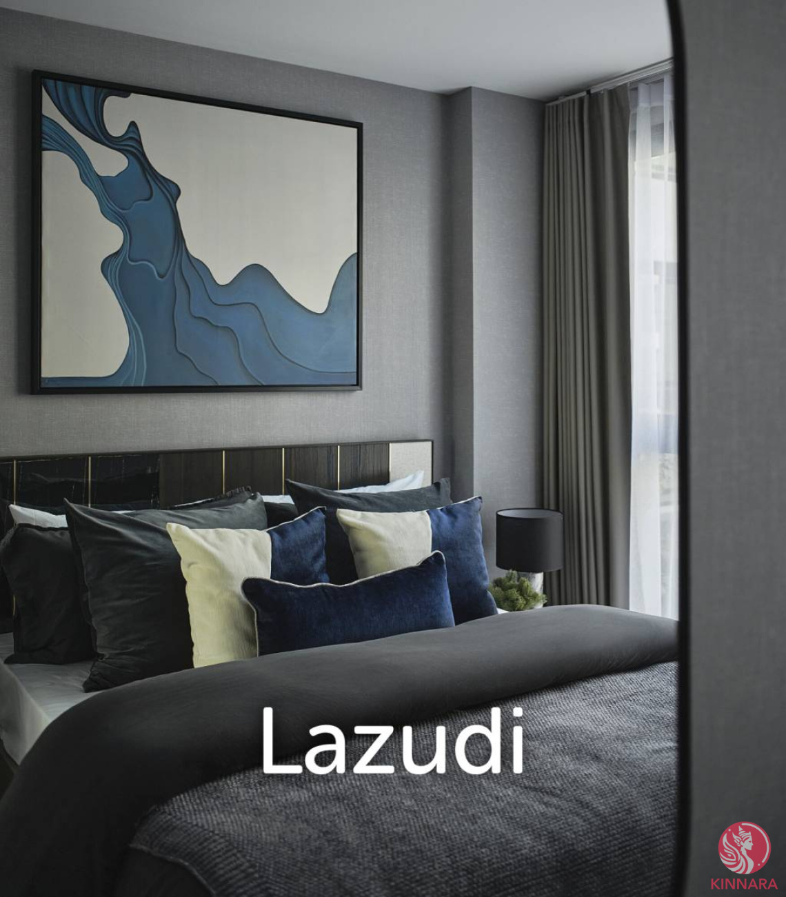 The bedroom features modern decor with plush bedding and an upholstered headboard flanked by bedside lamps, all in a calm gray and blue color scheme that highlights contemporary design. A large window, draped with floor-length curtains, ensures ample natural light, complementing textured grey walls and wall art, creating a sophisticated ambiance.
