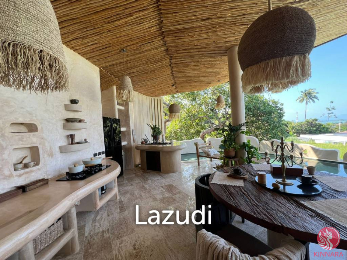 The villa boasts a modern and unique architectural structure adorned with curved elements, stone walls, and wooden accents. The open-concept design seamlessly integrates the indoor and outdoor spaces, providing stunning ocean and pool views. The villa is fully furnished, featuring natural wood ceilings, marble and stone flooring, and custom wooden furniture.