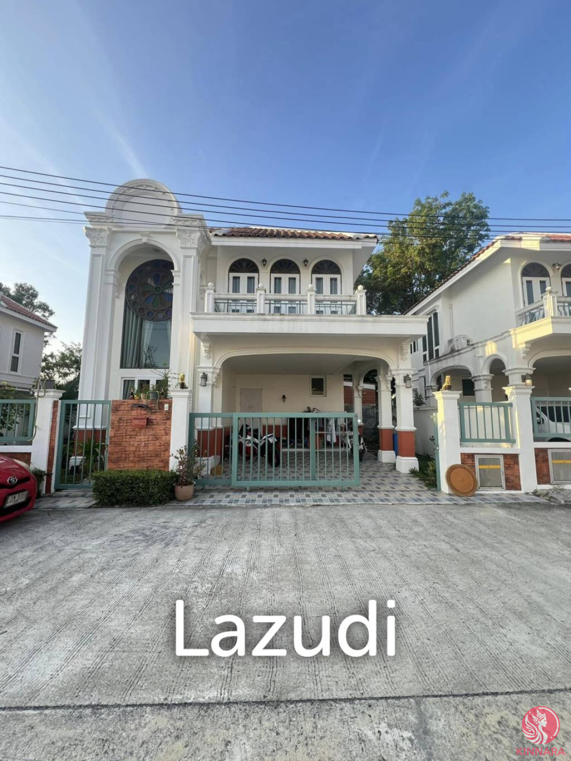 The exterior includes a gated driveway, large windows, and a balcony for enjoying the tropical weather. A meticulously maintained garden area with palm trees and grassy terrain adds to the charm. Experience the vibrant yet tranq