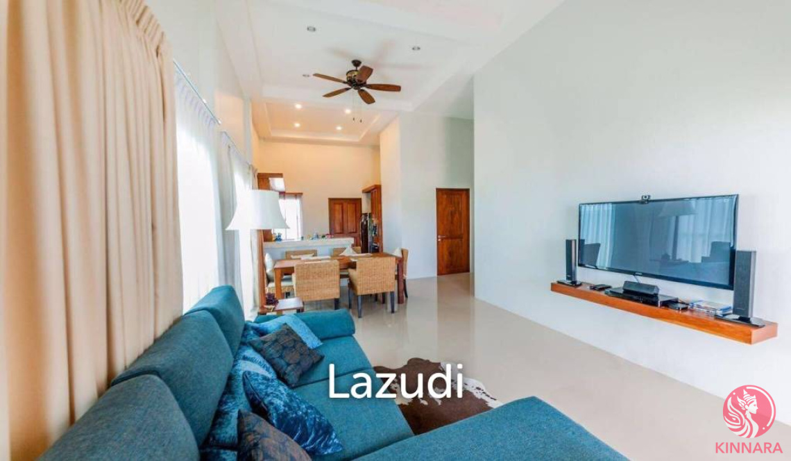 Charming Mid-Range Townhouse in Choeng Thale Prime Location in Thalang, Phuket Experience the perfect blend of comfort and style in this fully furnished, freehold townhouse, ideally situated in the sought-after area of Choeng Thale, Thalang. Priced at 5,500,000 THB, this single-storey property offers a spacious 106 sqm of interior living space on a 189 sqm land plot, making it a fantastic investment opportunity for mid-range buyers. Stunning Interior Design The expansive open layout living room features a large L-shaped sectional sofa adorned with throw pillows, a cowhide rug, and modern ceiling fan, offering a perfect space for relaxation. It boasts natural light through large windows with curtains, enhancing the room’s elegance. The dining area comfortably seats four, ideal for family gatherings. Additional conveniences include air conditioning, a flat-screen TV, and beautiful wooden furniture on tiled flooring. Comfortable Bedrooms and Modern Bathroom This property includes two well-appointed bedrooms, with the master featuring a cozy canopy bed with a wooden frame, bedside lamps, and an air conditioner to ensure a restful night’s sleep. Both rooms offer ample natural light from large windows with stylish curtains. The bathroom is designed with contemporary mosaic tiles, a walk-in shower, and a modern showerhead, providing a luxurious experience. Don’t miss the opportunity to own this charming townhouse in o