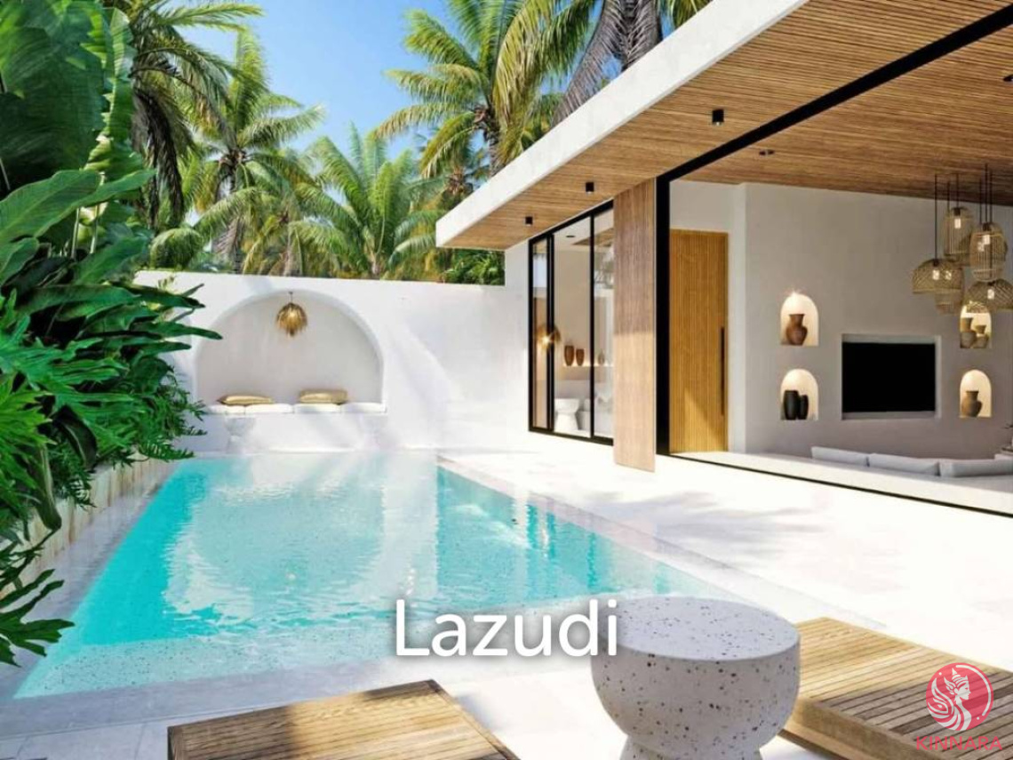 The villa is fully furnished with modern, high-end fittings, including a sleek kitchen with island seating and stylish wooden accents. Enjoy the convenience of a minimalist, sophisticated design with built-in shelves and recessed lighting throughout.