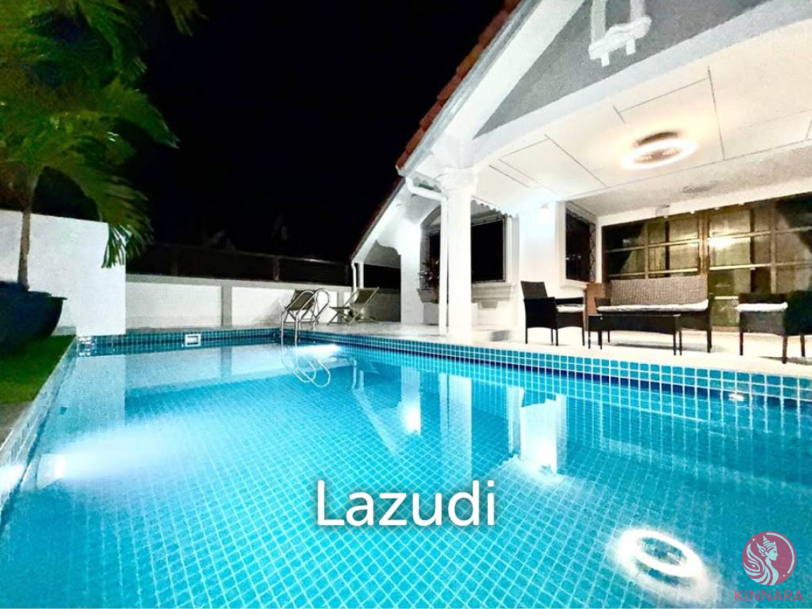 This is Single house 4 Bedrooms, 2 Bathrooms for Sale in East Pattaya, sitting on 300 Sqm of land plot size, 150 Sqm of usable area, comes full furnished, European kitchen, dining area, large living area with comfortable sofa, flat screen TV, goodsize bedrooms, wardrobe, en-suite bathroom, outdoor space with garden and private swimming pool.