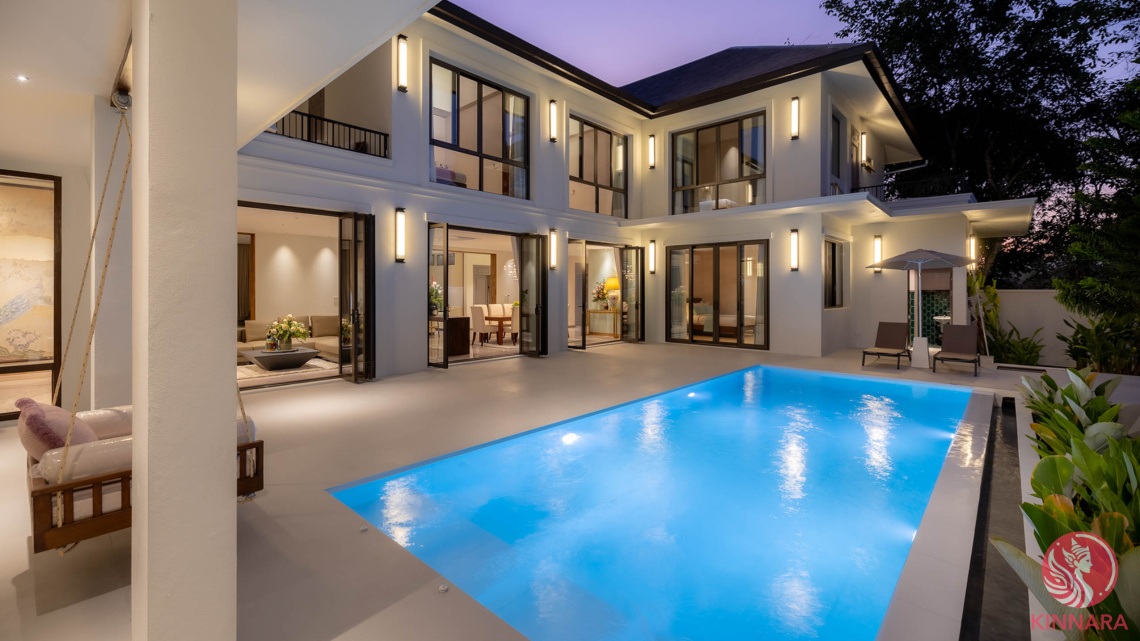 Discover refined luxury in this exceptional 5-bedroom villa located in the peaceful district of Saraphi, Chiang Mai. Designed for comfort and elegance, the home centers around a beautifully appointed 9x3.5m private pool, complete with a stylish covered lounge, cozy sofas, swings, and sunbeds—perfect for both entertaining and relaxing. Inside, a state-of-the-art Western kitchen with a sleek work island and bar complements the spacious open-plan layout, enhanced by high-end chandeliers and warm ambient lighting throughout.