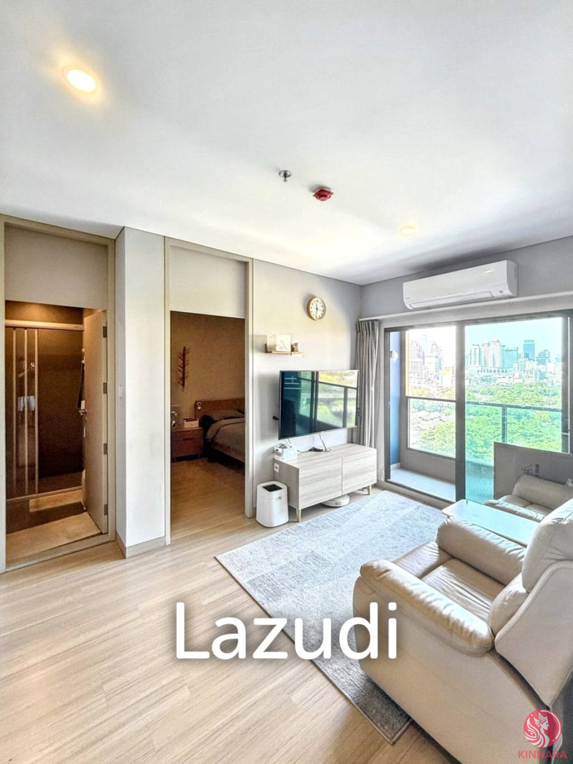 The open living area boasts a contemporary design with a neutral color palette. A large window invites abundant natural light, framing breathtaking city views. The space is complemented by a leather sofa, a wall-mounted TV, and air conditioning for ultimate comfort. Step out onto the balcony to experience the vibrant urban landscape.