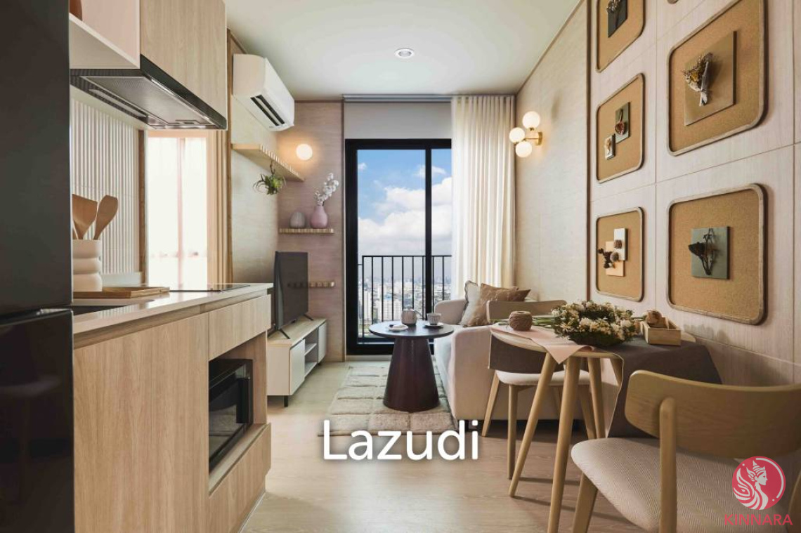 Elegant and Affordable Living in Bang Kaeo Discover the epitome of modern living with this exquisite 18th-floor condo in the esteemed Nue Mega Plus Bangna. Situated in the thriving neighborhood of Bang Kaeo, Bang Phli, Samut Prakan, this property offers an unmatched combination of convenience and style, with easy access to shopping centers, dining, and recreational activities. Contemporary Design and Features Spanning 26.58 sqm, this fully furnished one-bedroom, one-bathroom condo showcases a well-thought-out open-plan design that maximizes space and comfort. Large windows flood the living area with natural light, while the spacious balcony offers stunning views and fresh air, creating a serene atmosphere. Living Area: Features include sleek wooden flooring, a wall-mounted TV, air conditioning, and contemporary lighting, all set against a neutral color palette for a sophisticated touch. Bedroom: Equipped with a double bed, soft lighting, decorative wallpaper, and accent pillows, offering a cozy retreat with ample storage space. Kitchenette and Dining: Compact yet efficient, the space includes essential modern amenities and a round dining table for intimate meals. This freehold property within a new development ensures long-term investment potential with a price point of 2,755,000 THB, making it ideal for first-time buyers or investors seeking a robust an