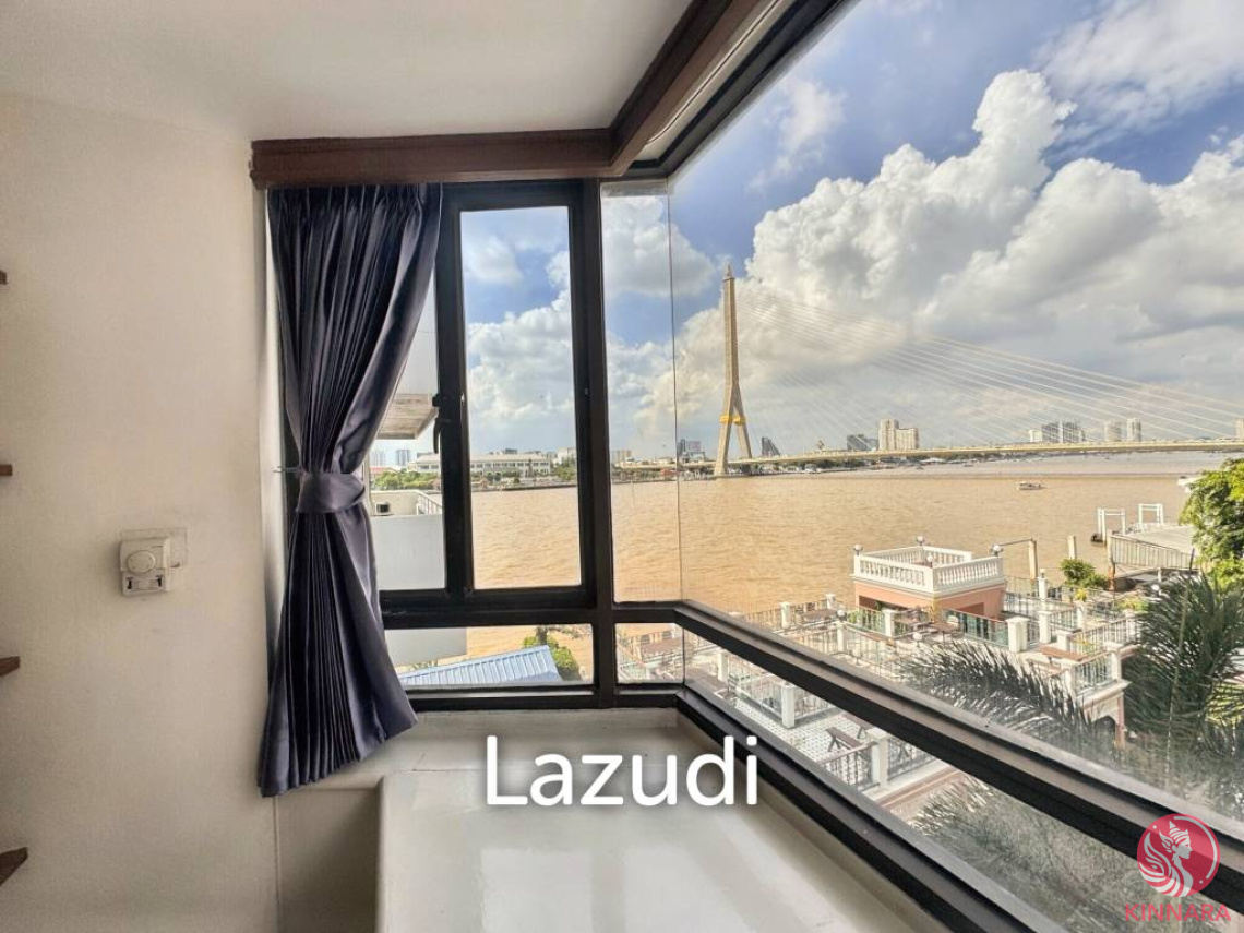 This third-floor condo boasts expansive floor-to-ceiling windows that bathe the living space in natural light, providing breathtaking views of the Chao Phraya River and an iconic bridge, creating an inviting ambiance. The spacious living area features built-in storage, maximizing functionality and comfort.