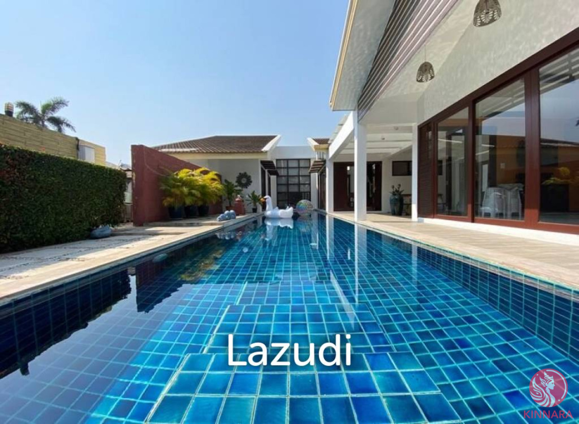 The L-shaped house has an area of 152 Sqw and has 2 entrances. The side entrance has a covered carport for one car, a guest toilet and a garden area which leads to the entrance of the house. Inside, the house to the left is a beautiful Western kitchen in red colour, dining area with tall ceiling and glass door access to the pool. On the other side is the sitting room, also with glass sliding doors and access to the covered deck by the pool ( pool size 4 x20 meters), it also has a view of the garden. Central air conditioning throughout. The floor is beautifully tiled and there is also a courtyard-style garden with decorations which can be enjoyed from the dining room.