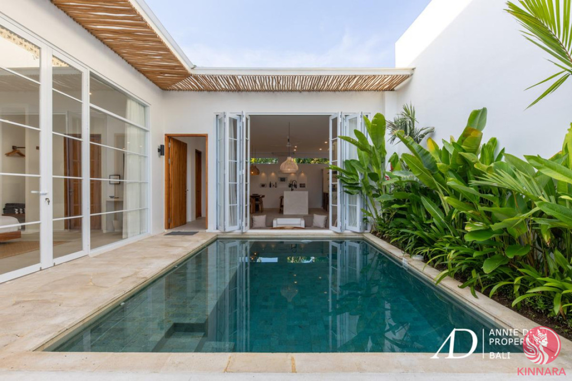 Newly constructed in 2024, the villa sits on 250 square meters of land with 198.66 square meters of enclosed living space. It features three spacious bedrooms with ensuite bathrooms, a guest powder room, an enclosed living area with sunken seating, a fully equipped kitchen, and a dining area. The villa opens to a landscaped garden with a 21.99-square-meter private swimming pool and includes a rooftop terrace for sunset entertaining. Built for both comfort and sustainability, the villa includes solar panels, two underground water tanks, 11,000 KVA PLN electricity, and high-speed internet infrastructure. IMB and SLF were issued in 2024. The property sits in a residential Yellow Zone with wide paved access.