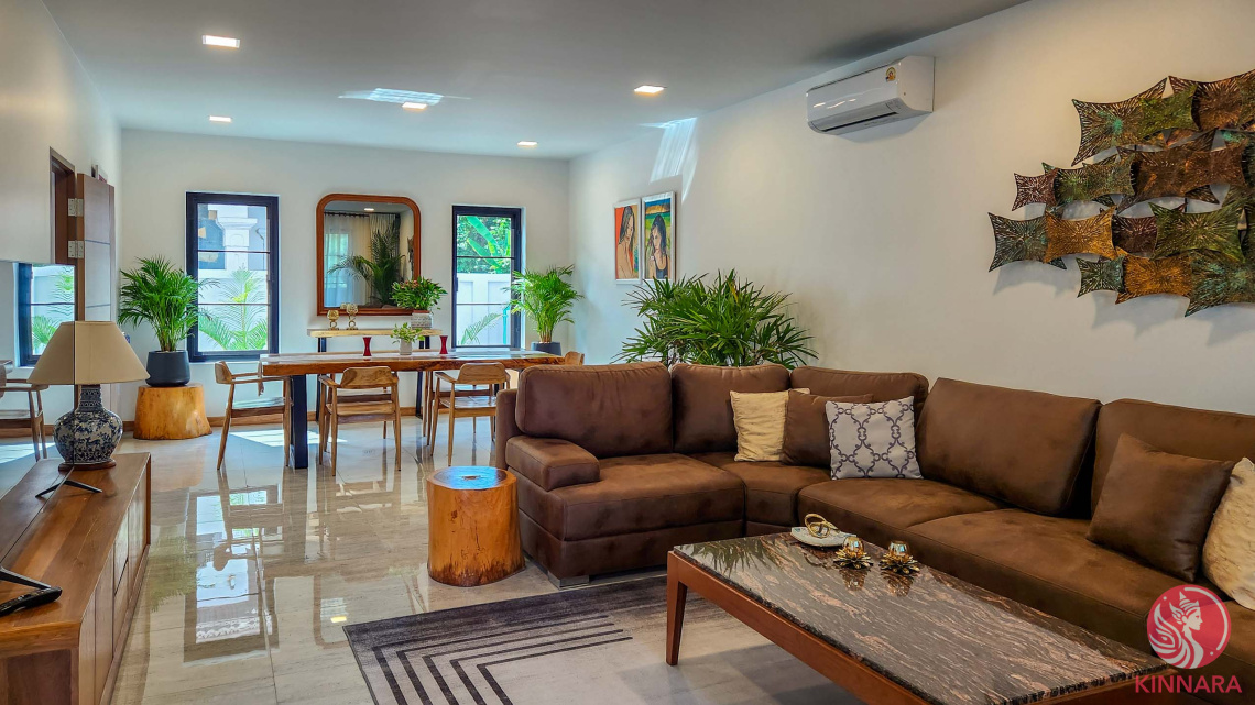 Inside, the living and dining area greets you with natural textures, stylish decor, and rich wooden furnishings that radiate a warm, organic feel. The bespoke western kitchen, separated by elegant sliding glass doors, features clean lines, handcrafted cabinetry, and a striking marble‑tile backsplash — offering both aesthetics and performance for the home chef.