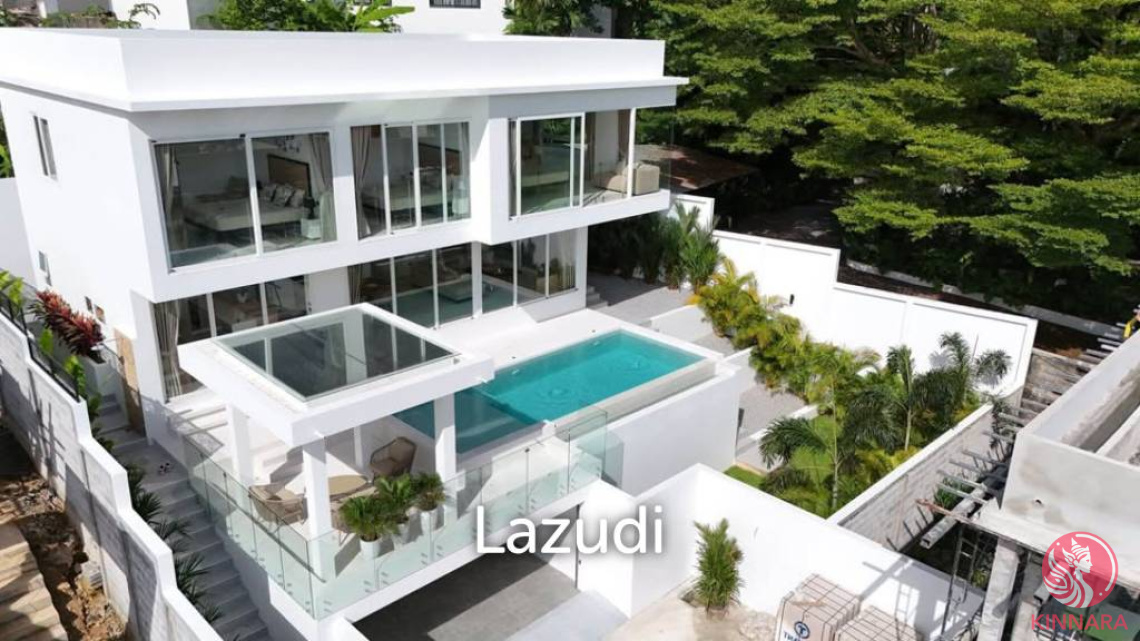 Exquisite Villa in Rawai, Phuket Nestled in the serene beauty of Rawai, Mueang Phuket, this stunning villa spans 320 sqm of interior space, set on a generous 350 sqm of land. This modern two-story structure exemplifies contemporary design with its sleek white exterior and expansive glass features. The villa’s open layout is accentuated by spacious balconies and floor-to-ceiling windows, offering abundant natural light and breathtaking views of the lush greenery surrounding the property. Elegant Living and Dining Areas The living room is a paradise of comfort and style, featuring a sectional sofa set against polished marble floors and augmented by decorative pendant lighting. Its seamless transition into the kitchen and dining area creates a harmonious space ideal for both relaxation and entertainment. The kitchen boasts top-of-the-line stainless steel appliances, a beautiful quartz countertop, and an island with bar stools. Luxurious Bedrooms and Bathrooms This fully furnished villa comprises three spacious bedrooms, each designed to maximize comfort with modern décor and plentiful natural light. The three bathrooms are outfitted with sophisticated amenities, including a glass shower enclosure, marble-style tiles, and wooden accents for a touch of warmth. Outdoor Oasis The outdoor area features a pristine swimming pool, perfect for cooling off under the Thai sun. Landscaped gardens enhance the sense of privacy and tra