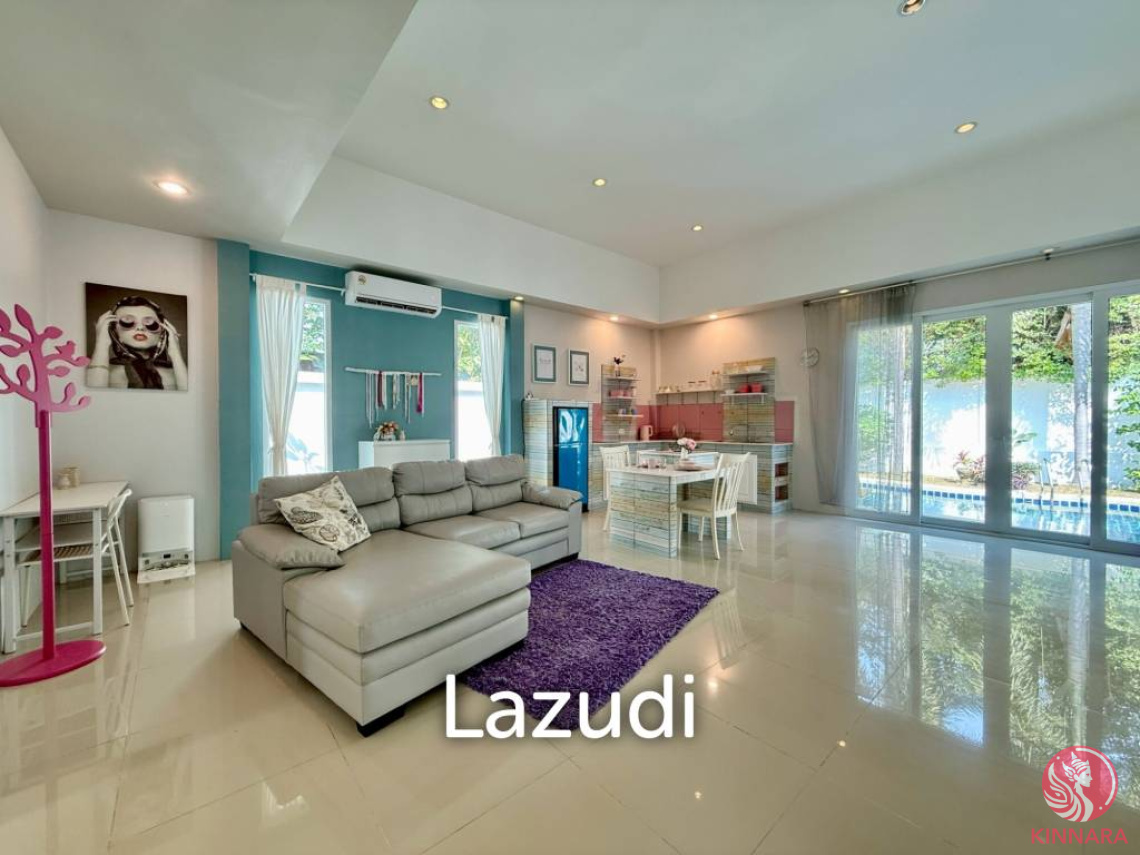This is Single House 2 Bedrooms, 2 Bathrooms for Sale in Huay yai. Is Available in Thai Company Name Ownership, sitting on 420 Sqm of land plot size, 116 Sqm of usable area, comes full furnished, fitted kitchen, open plan living area with comfortable sofa, flat screen TV, wardrobe, en-suite bathroom, outdoor space including garden and private swimming pool.