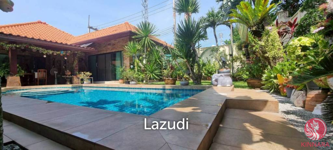 This house features 3 Bedrooms, 2 Bathrooms and 1 Guest toilet for Sale in Huay Yai. Setting on 549 Sqm of land plot size, 150 Sqm of usable area. The interior comes fully furnished, offering a European kitchen with a dedicated dining area, a spacious living room, and large bedrooms including a master suite with an enssuite bathroom. The exterior is a private oasis featuring a lush tropical garden and private swimming pool.