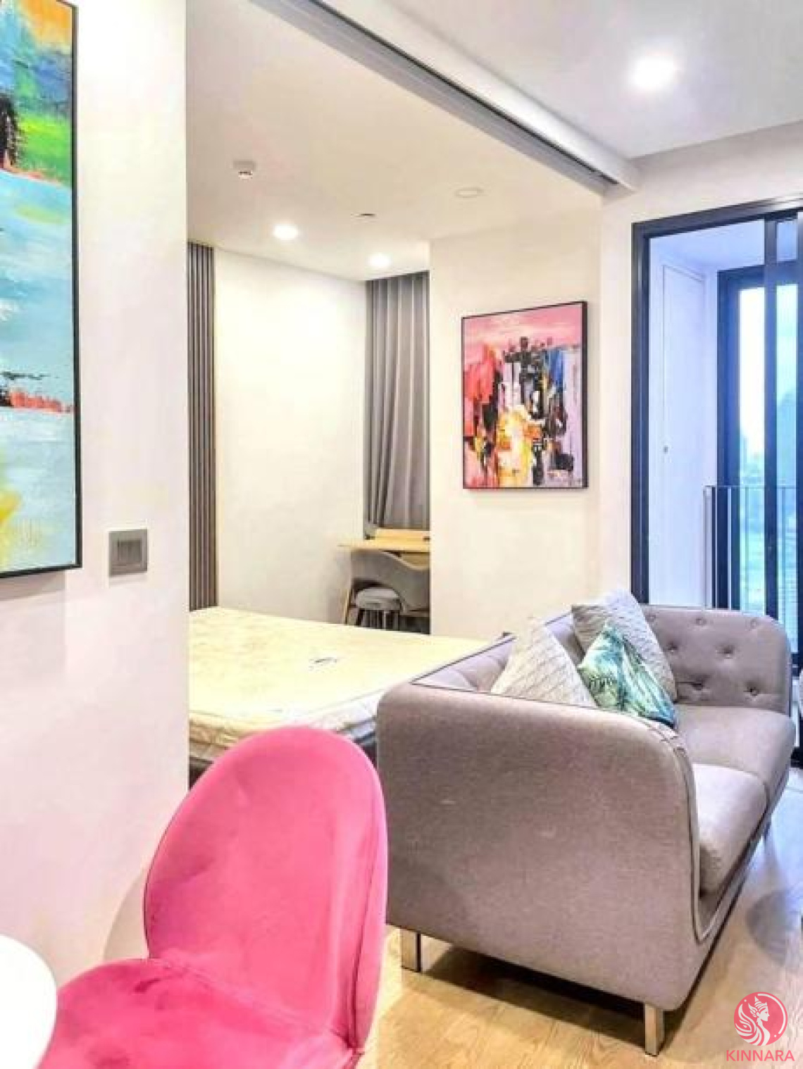 * The living area features an open-plan layout with chic decor, including a plush grey sofa, a pink accent chair, and striking artwork on the walls.