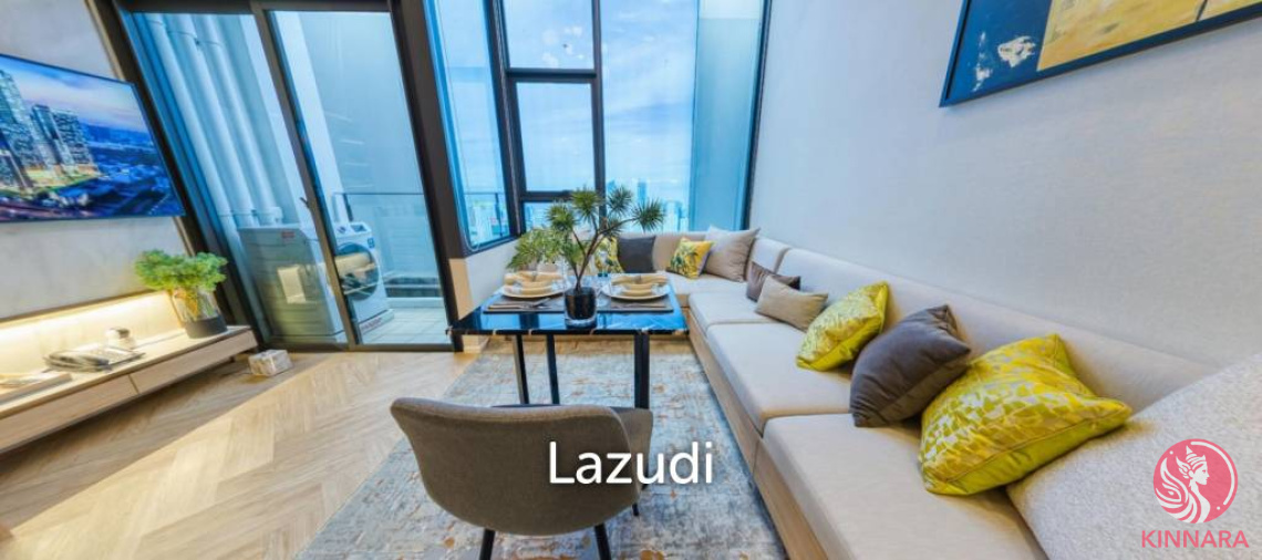 Elegant 1-Bedroom Condo in Bang Kapi, Huai Kwang Modern Living at Landmark @ MRTA Station Discover urban sophistication in this newly developed 1-bedroom condo located on the 16th floor of Siamese Rama 9 Tower B in Bang Kapi, Bangkok. Spanning 37.2 sqm, this freehold unit offers a spacious and well-designed floor plan ideal for both singles and couples. The living room is a haven of comfort with large floor-to-ceiling windows that flood the space with natural light, providing an unobstructed city skyline view. This area features elegant wooden floors, modern decor, and built-in shelving, and grants access to a private balcony, making it perfect for relaxation or entertaining guests. The well-appointed kitchen comes with wooden cabinets, a built-in microwave, and an electric stovetop. Its modern backsplash and sleek design make it as functional as it is stylish. The bedroom showcases a king-sized bed with mirrored walls, enhancing the sense of space. Modern lamps on side tables provide a soothing ambiance for restful nights. A chic glass partition closet and neutral color scheme create a serene environment. The bathroom features contemporary fixtures, including a bathtub with a glass screen, a wall-mounted toilet, and a vanity fitted with ample storage, all accentuated by stylish marble-like tiles. Experience refined urban living in a premier Bangkok location.