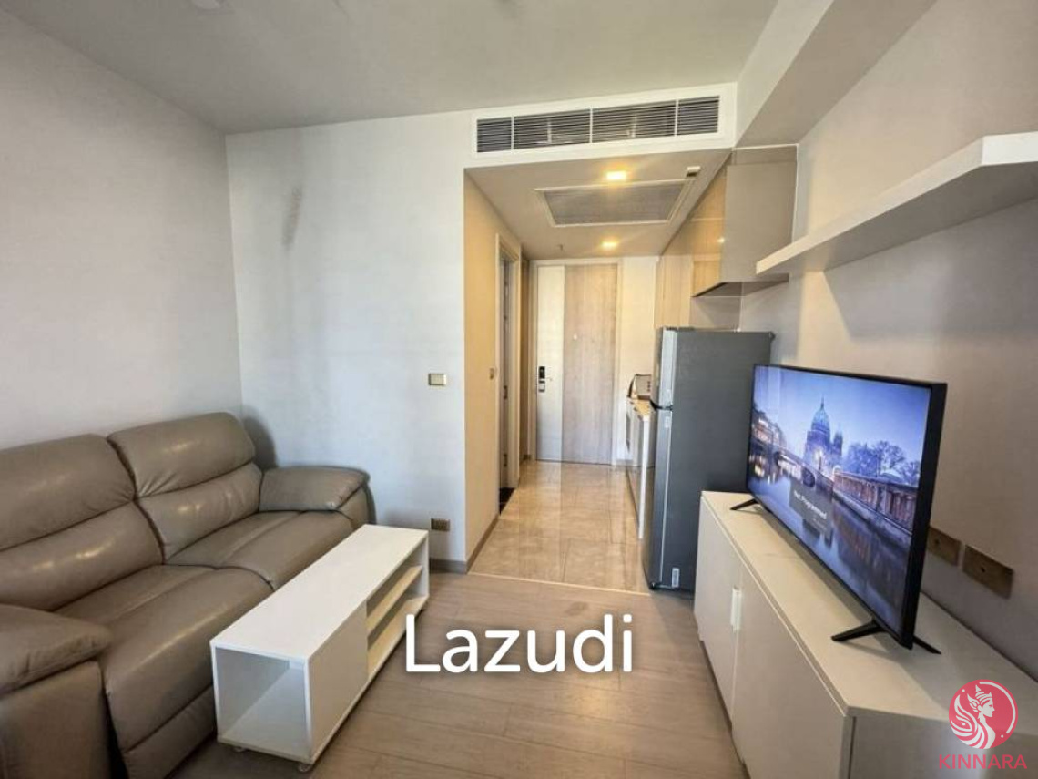 Professional overviewThis fully furnished studio condo offers a modern urban home in Huai Khwang, Bangkok. It is located in One 9 Five Asoke - Rama 9, a new 61-floor development. The unit sits on the 14th floor and has a compact 25.86 square meters layout. Ownership is freehold for long-term security.Main features and highlightsThe interior presents a contemporary open-plan studio design. A large bed sits in a studio-style sleeping area. A glass sliding partition helps define the living and bedroom zones. The living space includes a leather sofa and a small coffee table. A TV sits on a low media console with floating wall shelves above. The neutral color scheme and wood-style flooring create a calm atmosphere. Recessed ceiling lighting and a wall-mounted air conditioning unit support everyday comfort.The compact kitchenette uses built-in cabinets for storage. It features an under-mount sink and a solid surface countertop. A stainless steel refrigerator and microwave oven support simple cooking needs. The kitchen area has a tiled floor for practical maintenance. A separate bathroom area is accessed from the main studio zone. A vanity sink stands outside the bathroom for convenience. The unit includes one bathroom to serve daily use.Location and surroundingsThe condo is in the Huai Khwang district of Bangkok. The project stands in an area of modern city growth. Contemporary office buildings and glass and metal facades shape the