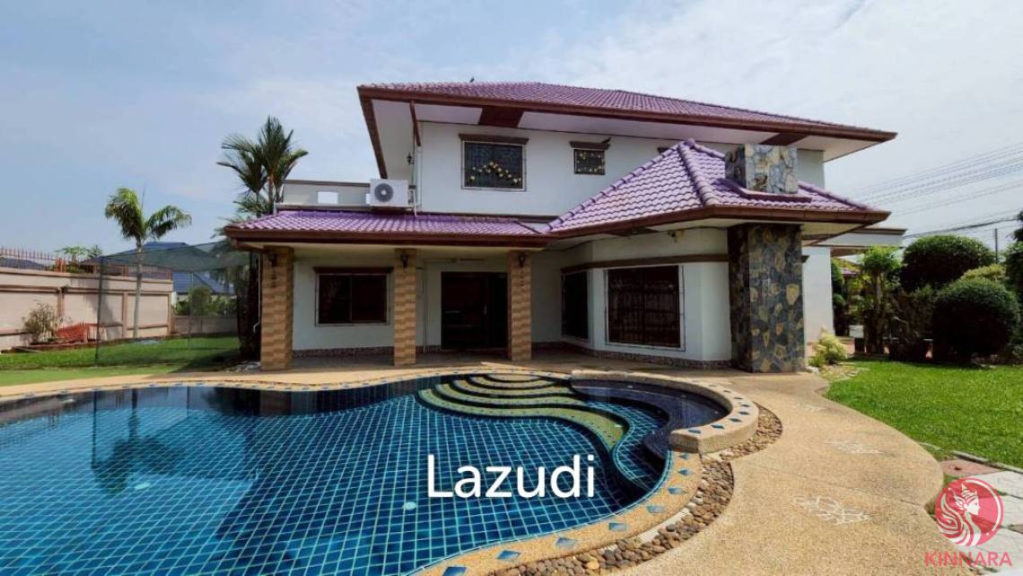 This is 2 Storey 5 Bedrooms, 5 Bathrooms House for Sale in Pattaya. Setting on 764 Sqm of land plot size, 700 Sqm of usable area, comes full furnished, built-in European kitchen including refrigerator, electric hob, electric oven, air con, en-suite bathroom, large space garden with private swimming pool.