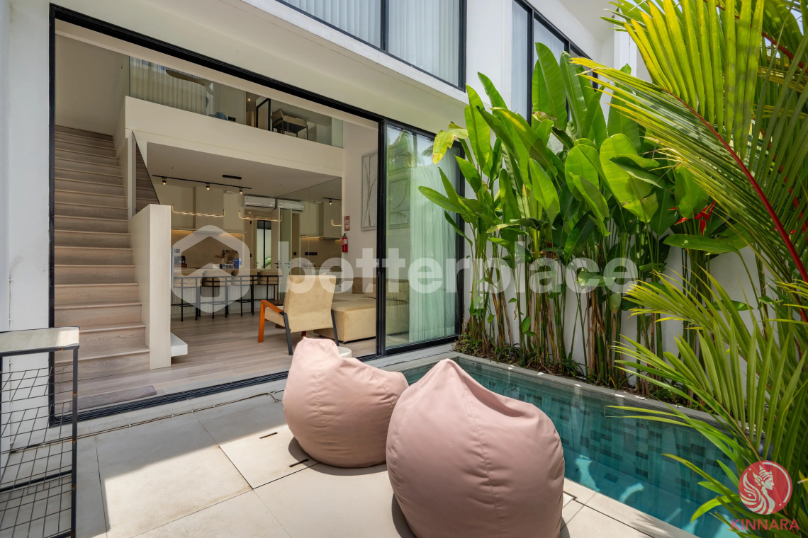 The villa features a fully enclosed living and dining area, creating a cool and comfortable interior environment throughout the year. Large sliding glass doors allow natural light to enter while maintaining the option for complete air-conditioned comfort. The kitchen is modern and functional, designed with clean lines, integrated storage, and a practical island layout that connects seamlessly to the dining space. Upstairs, the second living or lounge area provides additional flexibility—ideal as a reading corner, home office, or media space. Both bedrooms are well-proportioned with large windows that invite natural light while maintaining privacy. The design emphasizes soft neutral tones, warm wood flooring, and minimalist finishes, creating a timeless aesthetic that appeals to a wide rental market.