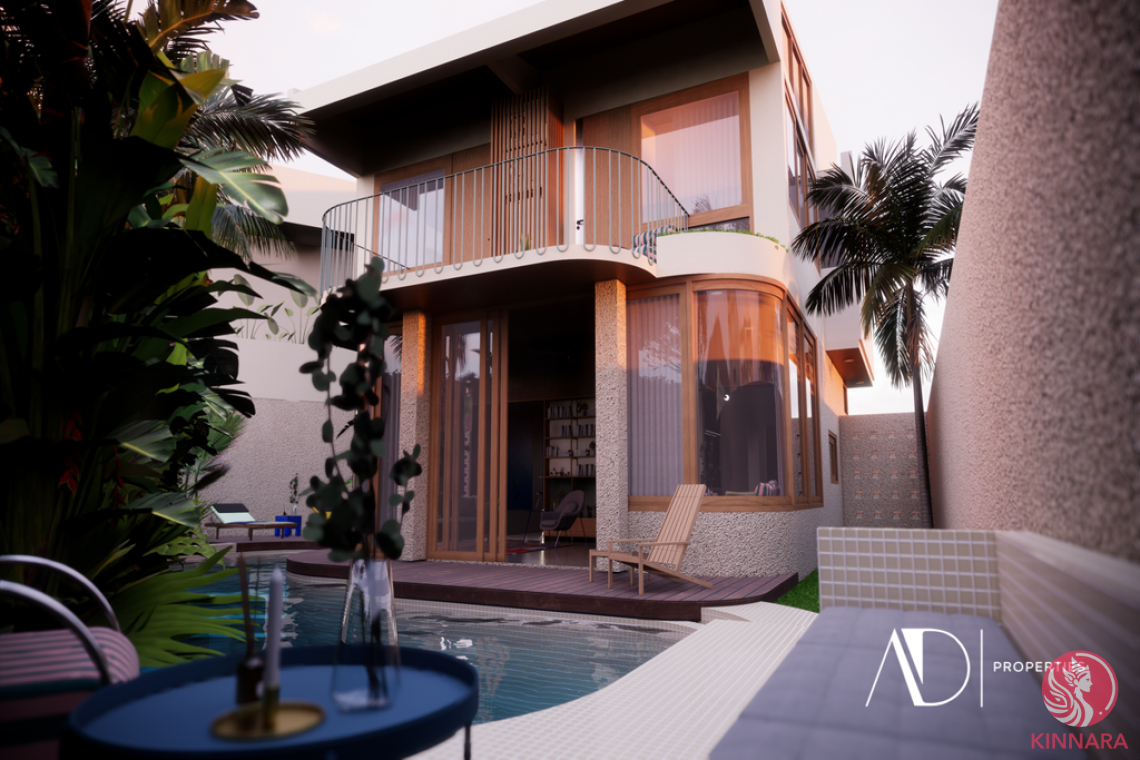 The layout includes two bedrooms, each with an ensuite bathroom, an enclosed living area, and a flexible dining and kitchen space. Upper-level balconies overlook the private pool and surrounding greenery, enhancing privacy and creating a relaxed residential atmosphere. The villa will be delivered fully furnished and turnkey, ready for immediate use upon completion.