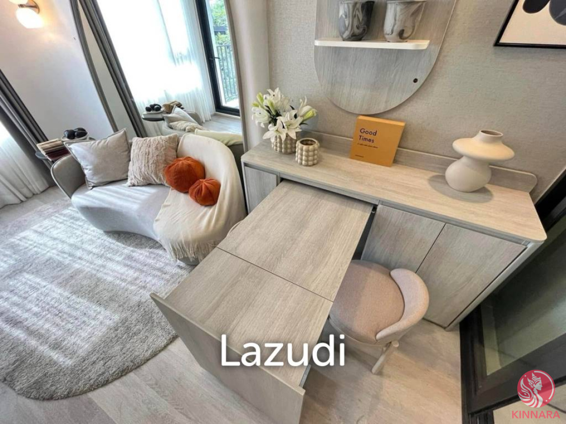 Professional overviewThis fully furnished 1 bedroom condo offers a modern living space in COBE Ratchada-Rama 9. The unit sits on the 4th floor of a 27 floor development in Huai Khwang, Bangkok. It provides 35.52 square meters of efficiently planned interior space under freehold ownership.Main features and highlightsThe living area presents a compact multifunctional space with a neutral color palette. Light wood cabinetry integrates built in storage and a pull out extendable table. A curved white sofa, cozy upholstered armchair and decorative orange pillows create a comfortable seating zone. A large window allows natural light into the room.The bedroom follows a modern minimalist interior design. It includes a double bed with upholstered headboard and cozy bedding. A textured feature wall, soft ambient ceiling lighting and recessed ceiling lights enhance the atmosphere. Built in shelving and light wood cabinetry offer organized storage and display shelves for books and decor. Soft curtains add privacy and warmth.The living area also features a built in floor to ceiling wardrobe with light wood doors. Minimalist handles keep the design clean and simple. A wall mounted flat screen TV is positioned opposite the seating area. An air conditioning unit and ceiling with recessed lighting detail support daily comfort.The modern compact kitchen uses light wood cabinetry and overhead storage cabinets. It includes a built in microwave and