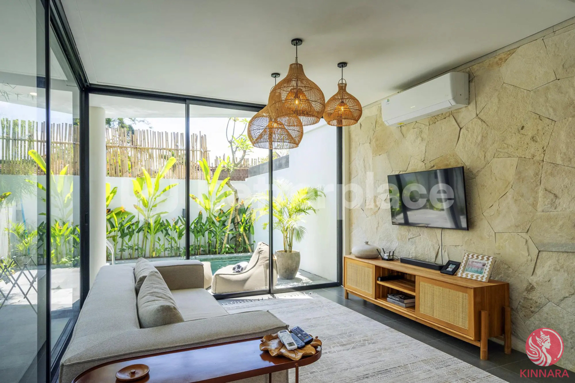 The main villa features two well-proportioned bedrooms complemented by a versatile office room, offering a functional layout that suits modern lifestyles. The additional workspace can easily serve as a home office, creative studio, or even a third sleeping area depending on the owner’s needs. Designed with a contemporary tropical concept, the property emphasizes open spatial flow and natural light through large windows and sliding glass doors. The enclosed living and dining area connects seamlessly with the outdoor pool terrace, creating a comfortable environment for daily living or hosting guests. Clean architectural lines, natural materials, and warm interior tones create a balanced atmosphere that feels modern while remaining in harmony with Bali’s tropical environment. The thoughtful layout also ensures privacy between living spaces and bedrooms, making the villa comfortable for long-term living or premium holiday rental use.