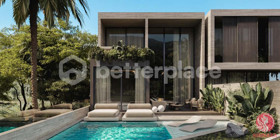 With essential amenities such as supermarkets, yoga studios, and restaurants only minutes away, residents can enjoy convenience while living in a peaceful residential setting. The villa features a thoughtfully designed two-storey layout that emphasizes natural light, open space, and modern architectural aesthetics. A spacious living and dining area on the ground floor connects seamlessly with the kitchen, creating a welcoming space for daily living or hosting guests. Large panoramic windows and high ceilings enhance the sense of openness and provide views toward the surrounding greenery. Natural materials play an important role in the interior design, with teak wood, travertine accents, and textured finishes adding warmth and character to the space.