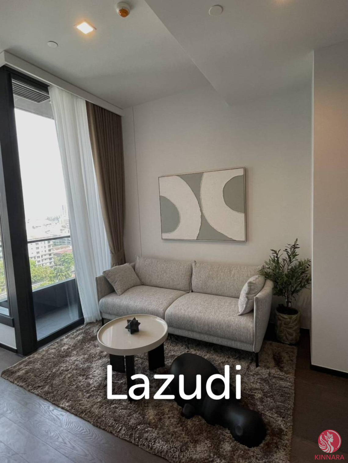 The living area presents a modern minimalist design with a neutral color palette. A light gray fabric sofa sits on a textured area rug beside a round coffee table with a decorative centerpiece. Large floor-to-ceiling windows deliver abundant natural light and connect to a balcony with a city view. Sheer white curtains combine with brown blackout curtains for flexible light control and privacy.