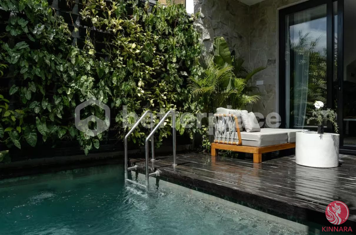 Outside the townhouse, residents have access to excellent shared amenities such as a public swimming pool and other communal facilities. Within the private area, there is a refreshing pool surrounded by a charming garden, ideal for relaxation. The townhouse is fully furnished with a sophisticated design featuring warm natural tones, high-quality materials, and large windows that allow abundant natural light inside.
