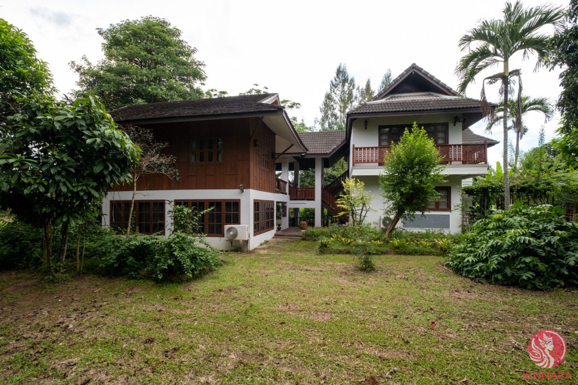 Discover a rare and exceptional investment opportunity in the highly sought-after Mae Rim district of Chiang Mai seeking a unique blend of nature and prestige. This captivating riverfront property is defined by its mature tropical trees, sweeping mountain vistas, and absolute privacy, being peacefully bordered by lush agricultural land. The older, classic Thai-style residence offers a foundation of timeless elegance, featuring exquisite original teak wood floors that run throughout the main living areas, a highly desirable architectural detail. The current simple Thai-style kitchen is functional but presents a clear canvas for a luxurious modern upgrade. The expansive layout centers around a large, signature balcony, providing a coveted outdoor sanctuary with views of the gardens, the river, and the surrounding majestic mountains—an unmatched setting for sophisticated entertaining or tranquil personal enjoyment. Access is simple and reliable via a well-maintained paved road, ensuring quick transit to Mae Rim’s upscale amenities, including premier resorts, international schools, and renowned dining options, while still retaining the estates very peaceful, retreat-like atmosphere. This unique property provides not just a home, but a luxurious, nature-immersed lifestyle poised for significant value appreciation.