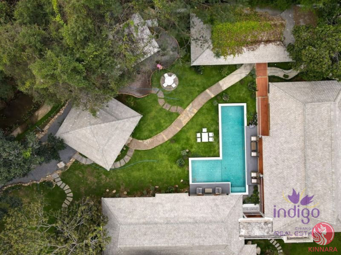 5 Bedroom Compound Beside Canal in Hang DongLand : 3,116 sq,m Living area : 600 sq,m Newly renovated western style compound on beautiful canal-side grounds just off canal road in Hang Dong. This unique property features three main buildings plus maid’s quarters. The main building has a covered walkway from the driveway and features the grand living room and dining area along with western kitchen. There is a patio beside the L-shaped 3 by 12 meter saltwater swimming pool. A covered walkway leads to the three main bedrooms, all with en suite bathrooms. The master bedroom has a living room, large en suite bathroom, and outdoor shower/bath area. The two guest bedrooms share a separate covered terrace and back entrance.The second building has a bedroom, bathroom, and laundry. The garden has a large covered sala with a dining area beside the canal and next to an outdoor western-style kitchen. There is also an authentic Thai style bungalow besides the canal with living area below and private bathroom.