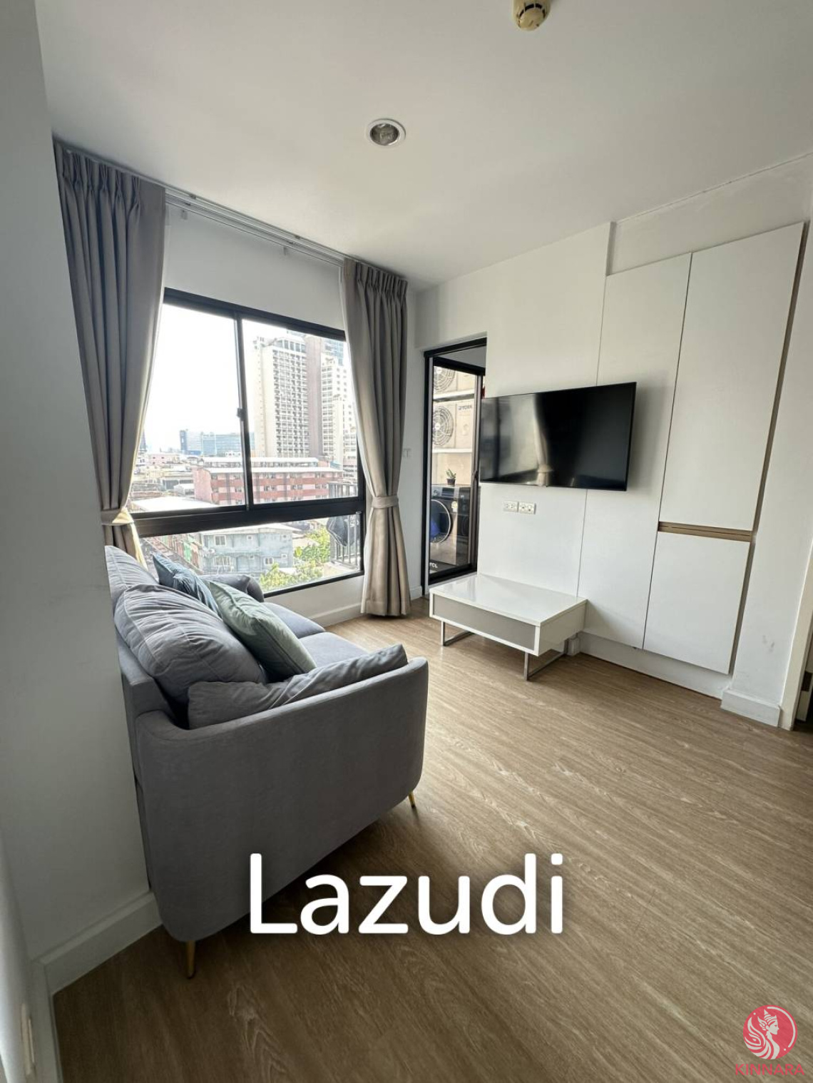 The living area feels airy with a large picture window and strong natural light. A compact modern sofa faces a wall-mounted flat-screen TV and built-in white cabinetry. Light wood-style flooring and a neutral color palette create a clean, contemporary impression. Ceiling spotlights and floor-to-ceiling curtains complete the comfortable lounge space.
