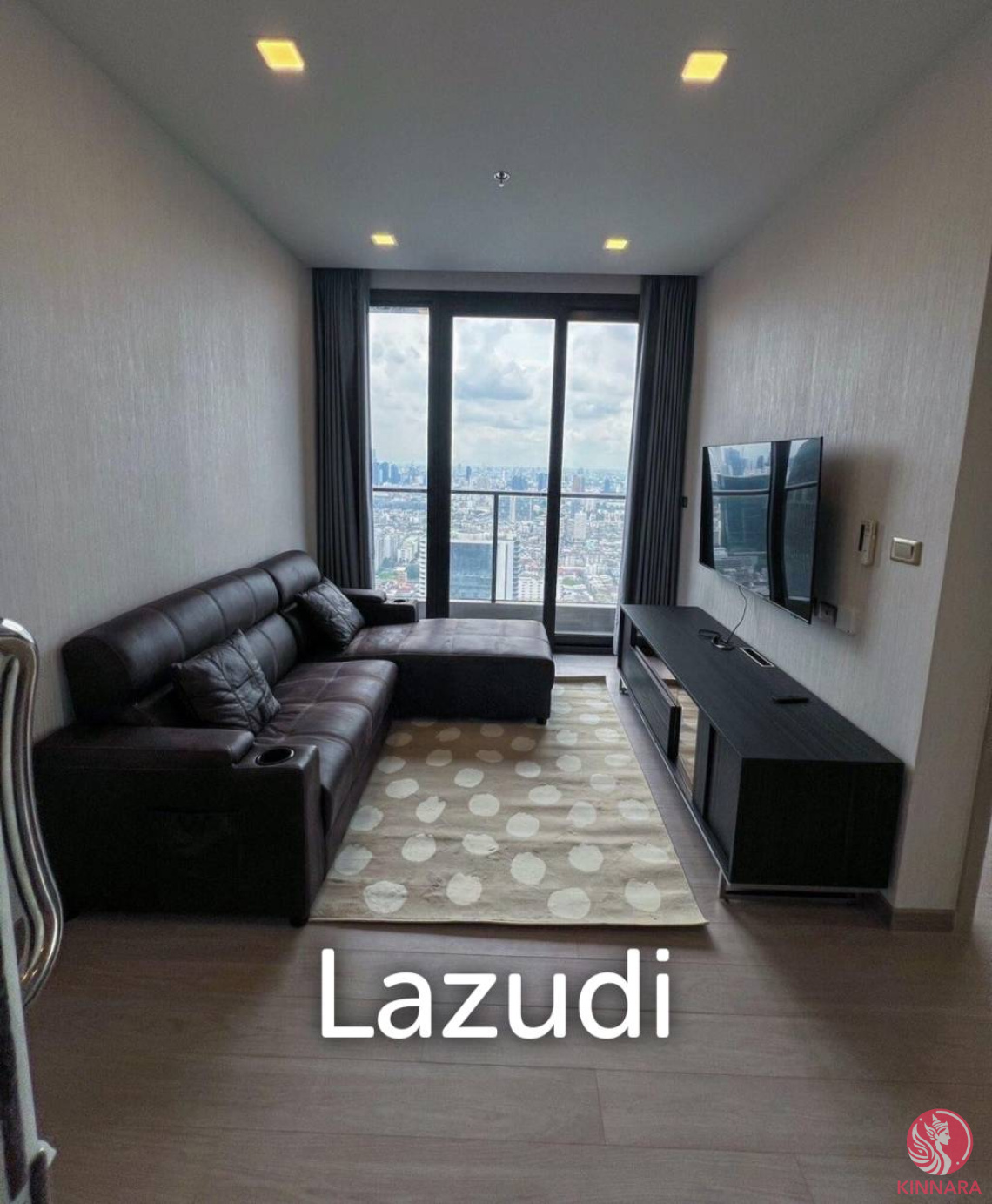 Professional overviewThis modern 2-bedroom condo offers a high-floor lifestyle in One 9 Five Asoke - Rama 9, Huai Khwang. The unit spans 57 sqm and sits on the 46th floor with a commanding urban skyline view. It is a freehold property and comes fully furnished for immediate move-in or rental use.Key features and layoutThe living area presents a contemporary open-plan design with floor-to-ceiling windows and a wide city outlook. A dark leather sectional sofa faces a wall-mounted flat-screen TV and a long low console, creating a comfortable entertainment zone. Light wood flooring and a neutral color palette give the space a clean and modern feel.The open-plan kitchen connects seamlessly to the living and dining areas. It features glossy upper and lower cabinets, a built-in electric cooktop, a built-in microwave oven, and a large black refrigerator. A marble-style dining table with four upholstered chairs offers a dedicated space for meals and casual gatherings.Both bedrooms include double beds with upholstered headboards and light-colored wood flooring. Large or floor-to-ceiling windows draw in natural light and showcase panoramic city views from this high-rise setting. Built-in wardrobes, including open hanging space and sliding-door storage with glass or glossy panels, help keep the rooms organized. Area rugs and matching bedside tables add a soft, refined touch.The condo offers two modern bathrooms with floor-to-ceiling tiles