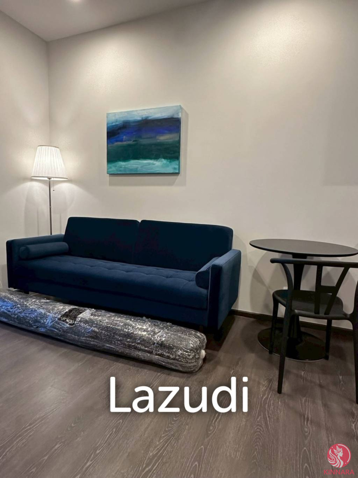 Modern 1 bedroom condo overviewThis modern 1 bedroom, 1 bathroom condo offers 34.75 square meters of efficient living space on the 21st floor of OKA HAUS Sukhumvit 36 in Khlong Tan, Khlong Toei, Bangkok. The unit is available under freehold ownership and comes fully furnished for immediate use.Key features and interior highlightsThe living area presents a compact layout with a dark blue three-seat sofa and bolster cushion. A floor lamp with a white pleated shade and abstract wall art create a stylish atmosphere. Dark wood style flooring and neutral walls support a modern minimalist design. A small round dining table with two matching chairs provides an intimate dining corner. A wall-mounted flat-screen TV faces the seating area for convenient entertainment.Large floor-to-ceiling windows in the living space bring abundant natural light and a city view. A glass door leads to a private balcony or small terrace that extends the living area. The 21st floor position gives a clear high-rise outlook over the surroundings.The compact kitchen is modern and functional. It features a built-in sink with a single lever faucet and a solid surface countertop. A dark glossy or glass backsplash adds a sleek finish. Upper glossy cabinets and open shelving offer storage for daily essentials. Lower base cabinets with drawers increase practicality. A refrigerator in a stainless steel or metallic finish is integrated into the layout.The bedroom conti