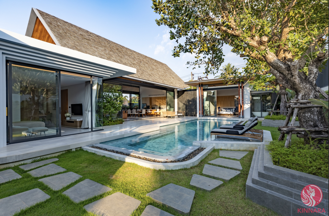 Each villa offers a perfect blend of modern design and Thai elegance, featuring spacious living areas with impressive 8-meter-high ceilings, 4 ensuite bedrooms, and a beautifully designed outdoor pavilion ideal for entertaining or relaxing.