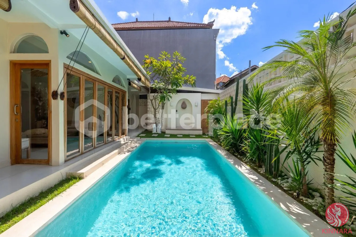 Discover a private sanctuary in the heart of Umalas with this beautifully designed 2-bedroom villa available on a leasehold basis. Surrounded by lush tropical gardens and enclosed by high privacy walls, the villa features a welcoming swimming pool, a generous layout, and a peaceful indoor-outdoor flow—perfect for those seeking comfort, convenience, and a serene lifestyle near vibrant neighborhoods. The villa includes two fully air-conditioned bedrooms with large glass doors that open onto the pool area, allowing plenty of natural light.