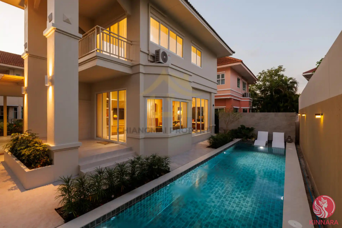 Light-Filled Modernity and Dual-Kitchen UtilityThe 2026 renovation has transformed this villa into a seamless open-plan master piece. The Heart of the Home is avast living area that integrates the kitchen and dining spaces, allowing natural light to flow directly from the garden and the pool deck into the interior. Designed for practical family living, the floor plan includes a rare ground-floor bedroom—essential for multi-generational usage or a dedicated post-2024 home office. Culinary enthusiasts will appreciate the rare dual-kitchen setup, featuring both a modern Western kitchen and a traditional Thai kitchen for high-heat cooking.