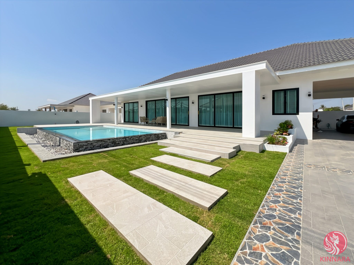 Each villa is delivered fully fitted and fully furnished, ready to move in. All three bedrooms are equipped with built-in wardrobes, while the outdoor terrace features a dining table and chairs, perfect for entertaining or relaxing. The front lawn is beautifully landscaped with tropical plants, creating a welcoming and serene environment. The project comes with a full Chanote title deed and no common fee, offering complete ownership and cost efficiency.