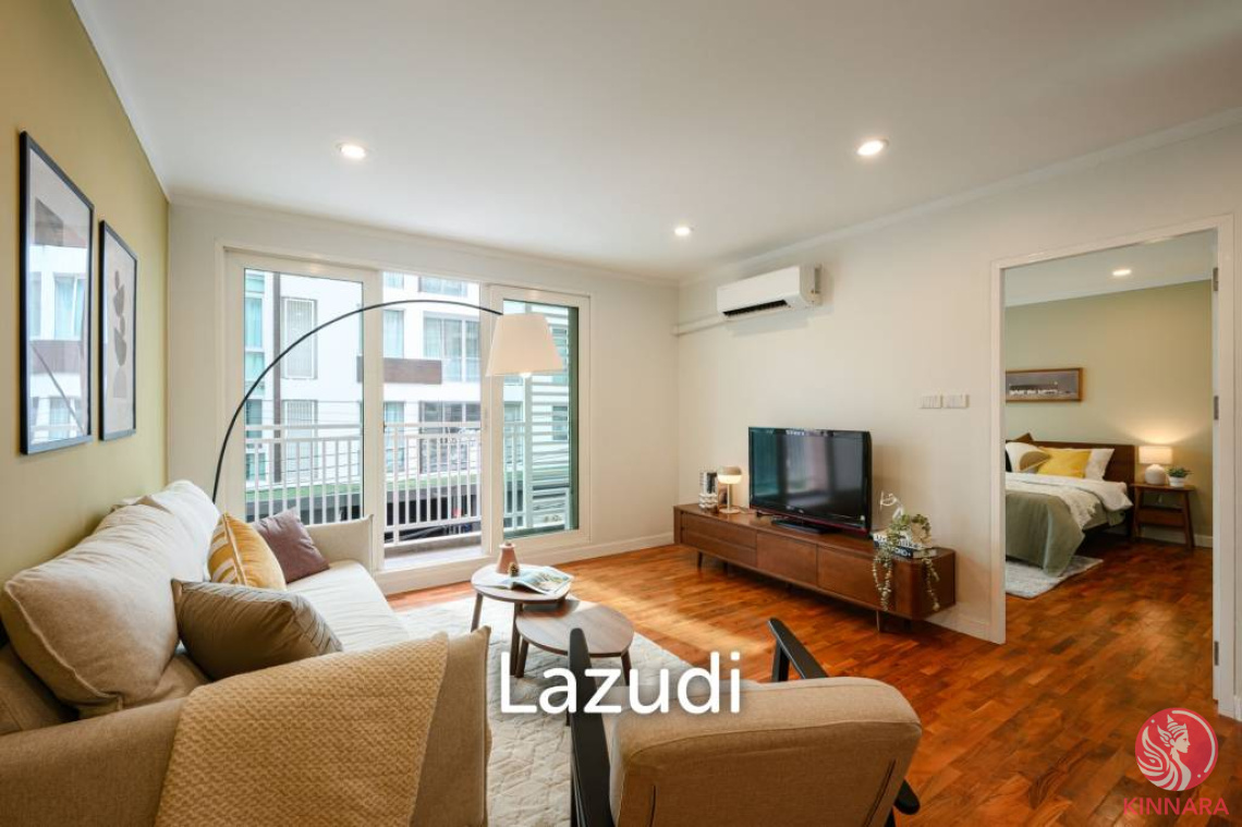 Professional overviewThis 56 square meter freehold condo offers a spacious one bedroom layout in Baan Siri Sukhumvit 13 in Khlong Toei Nuea, Wattana, Bangkok. The residence sits on the 2nd floor of an 8 floor low rise building with only 73 units, creating a more private living environment. It is fully furnished and ready to move in with a warm, contemporary interior style.Key features and interior highlightsThe open plan living and kitchen area creates a comfortable daily living space. Warm hardwood flooring and recessed ceiling lights give the living room a modern, inviting feel. Large sliding glass doors and windows open to the balcony and allow generous natural light into the room. A fabric sofa with accent cushions, area rug, and modern coffee tables define the seating zone. A low wooden media console with flat screen TV and a wall mounted air conditioning unit support relaxed living and entertainment.The compact kitchen area features modern white and dark wood cabinetry, a sink, and storage. Neutral wall colors and a feature wall in a warm tone add visual interest without overpowering the space. The indoor outdoor connection from the living area to the balcony provides extra airflow and a pleasant urban outlook.The bedroom is spacious and bright with a large double bed and layered bedding. Wooden flooring continues here for a cohesive feel. An accent wall behind the bed in a soft green or neutral tone enhances the restful atmosph