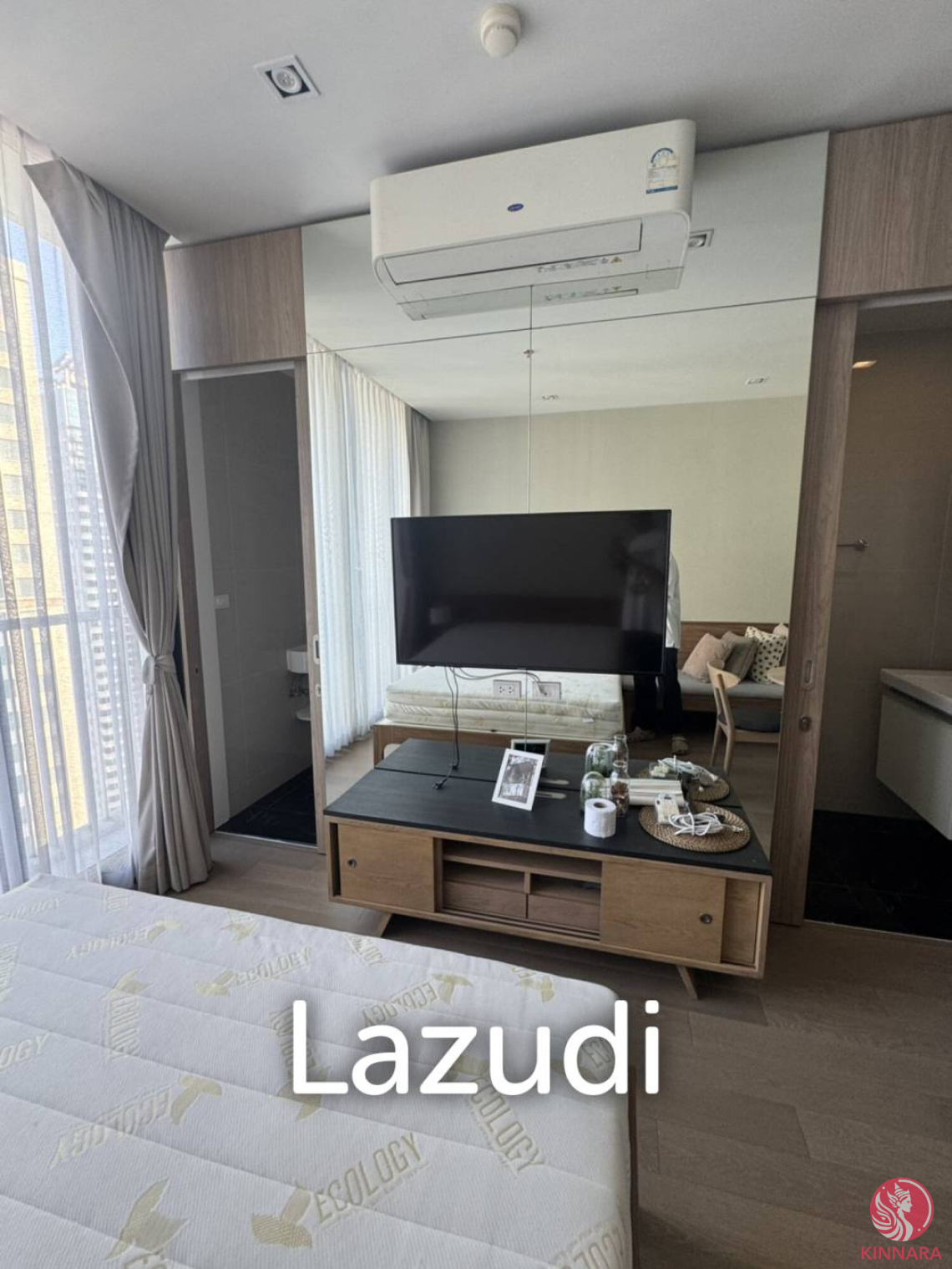 Professional overviewThis modern 1 bedroom condo offers a bright 25.9 square meter living space on the 29th floor of Park Origin Phromphong in Khlong Tan, Khlong Toei, Bangkok. The unit is in a new high rise development with 51 floors and 940 units and comes with freehold ownership and full furnishings.Key features and highlightsThe layout follows a studio style concept with a combined living and sleeping area separated by a sliding glass door partition in the corner bedroom zone. Large floor to ceiling windows provide abundant natural light and a broad city view from the high floor. Light wood flooring and neutral wall colors create a clean modern atmosphere.The bedroom area includes a large double bed with mattress, built in wooden headboard and shelving, a built in wardrobe or mirrored storage, a bedside table and a table lamp. A built in side bench or daybed sits by the window for relaxation. A wall mounted flat screen TV is set on a contemporary wooden console and an air conditioning unit serves the room.The main living space incorporates a round wooden dining table with matching wooden dining chairs for casual meals. A built in or integrated daybed or sofa with cushions provides extra seating. Floor to ceiling glazing with sheer and blackout curtains allows flexible light control and privacy.Kitchen and laundry aspectsThe compact kitchenette features a black stone look countertop with a built in stainless steel s
