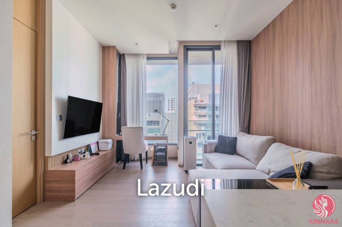 Professional overviewThis 46.5 square meter freehold condo at The ESSE Asoke offers a modern one bedroom layout on the 28th floor in Khlong Toei Nuea, Wattana, Bangkok. The home presents a bright open plan living style with contemporary finishes and full furnishings ready for immediate use.Main features and key detailsThe living area gives an open plan impression with light wood flooring and a neutral color palette. Large floor to ceiling windows fill the room with natural light and provide a city view. A fabric sofa with throw pillows faces a wall mounted flat screen TV and a wood panel feature wall adds warmth.The open plan extends to a compact modern kitchen. Built in upper and lower cabinets offer storage with dark wood grain or grey finishes. A light colored solid surface countertop and a kitchen peninsula or breakfast bar create a practical work and dining zone. The kitchen includes an integrated cooktop, a built in electric oven and likely a built in microwave form based on the visible appliances.The bedroom continues the modern design with light wood flooring and a wood accent wall behind the double bed. Neutral bedding, built in bedside tables, bedside power outlets and bedside light switches support comfort and convenience. A large floor to ceiling window with sheer curtains and blackout drapes allows natural light by day and privacy at night. A built in wooden wardrobe provides storage and a wall mounted flat screen TV adds