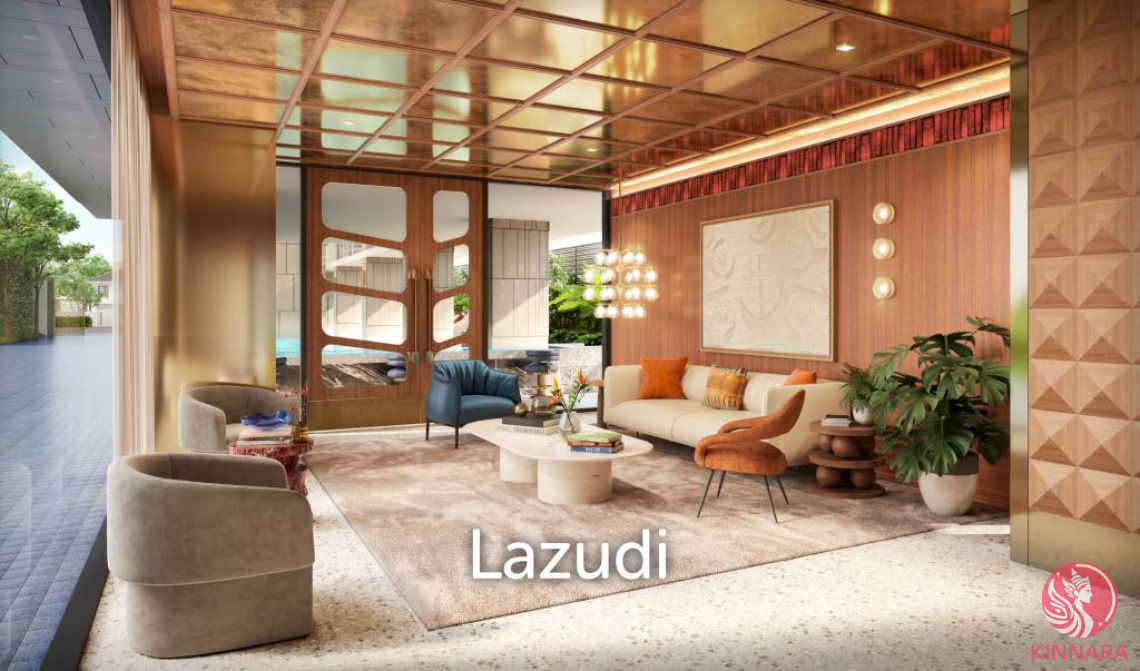 Professional OverviewThis 2-bedroom, 2-bathroom condo offers 88.8 square meters of stylish living in Via 34, Khlong Tan, Khlong Toei, Bangkok. The freehold residence sits on the 3rd floor of a 7-storey low-rise project with only 45 units, creating a private and refined atmosphere. The unit is fully furnished and finished to a high contemporary standard with distinctive design elements.Key Features and Interior HighlightsThe interior delivers an open-plan feel with a bright living and dining area. Large windows and floor-to-ceiling sliding glass doors bring in abundant natural light and frame green outdoor views. The living spaces feature modern mid-century inspired design, warm wood wall paneling, and decorative wood and glass doors. Terrazzo-style textures, terrazzo stone flooring, and textured stone wall finishes add character and visual depth.The ceiling design stands out with copper or metallic coffered detailing, mirrored ceiling panels, ambient cove lighting, and recessed lighting. Designer pendant lights and multi-globe chandeliers create a luxurious yet inviting mood. Furnishings include upholstered sofas and armchairs in neutral, blue, and red tones, complemented by patterned rugs, marble or stone coffee and side tables, and a glass bar cart. Decorative cushions, wall art, and a round wall mirror complete the sophisticated look.The dining area presents a modern setting with a rectangular stone or marble-topped table and a sep